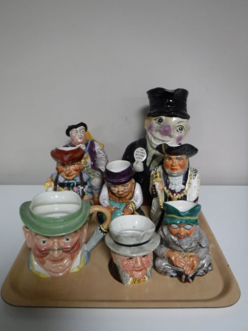 A tray containing eight assorted character jugs, Wedgwood, Crown Clarence, Kelsbro ware, etc