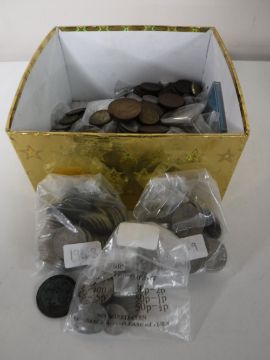A box containing a quantity of mid 20th century coins, Georgian pennies, crowns, Roman coin etc