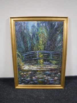 A gilt framed oil on canvas depicting a footbridge over a stream signed Franci