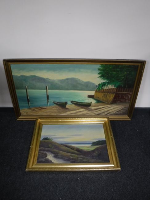 Five gilt framed continental school oil on canvas paintings, Mediterranean scenes and landscapes