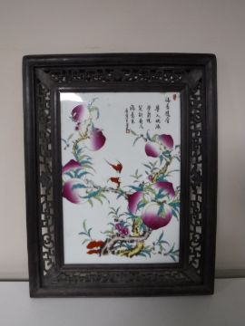 A Chinese porcelain panel in a carved hardwood frame