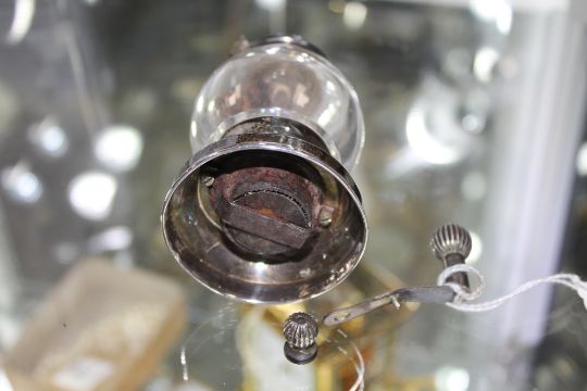The mechanism works. Hallmarks match on both the upper and bottom section. Maker's mark sadly illegible. Birmingham 1900. The base is engraved with a crest. Numerous tiny dents and scratches. 10cm high with handle, 5.5cm wide. The handle has been replaced. The new one has been attached to the remnants of the original. See images.