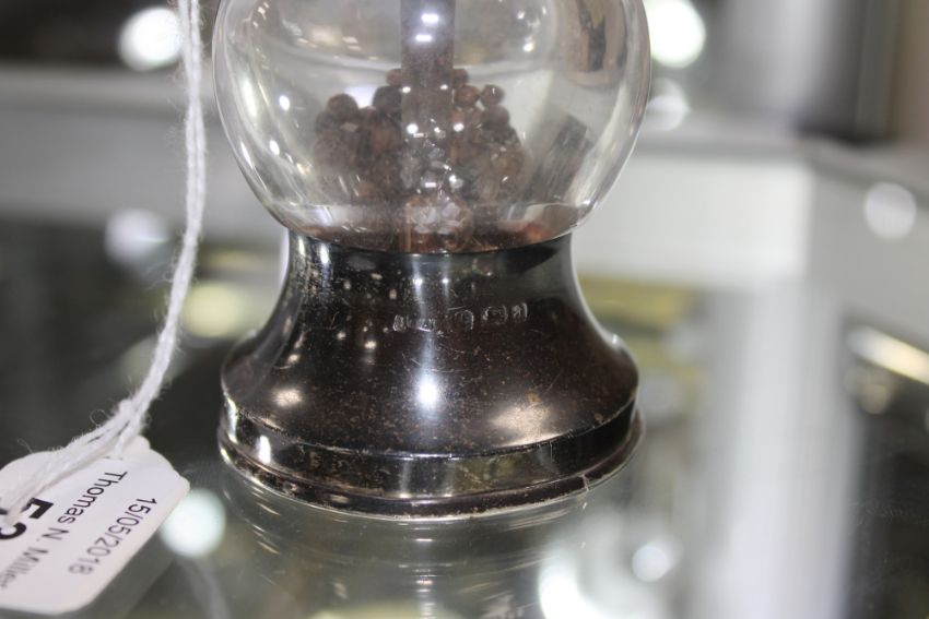 A silver and glass pepper mill