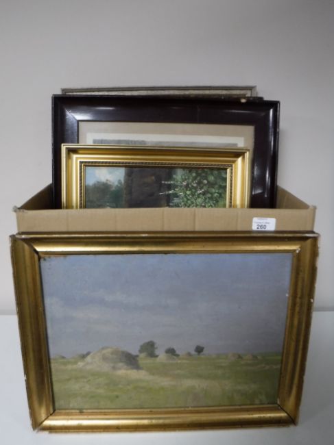 A box of a quantity of continental school oils on canvas, pictures and prints