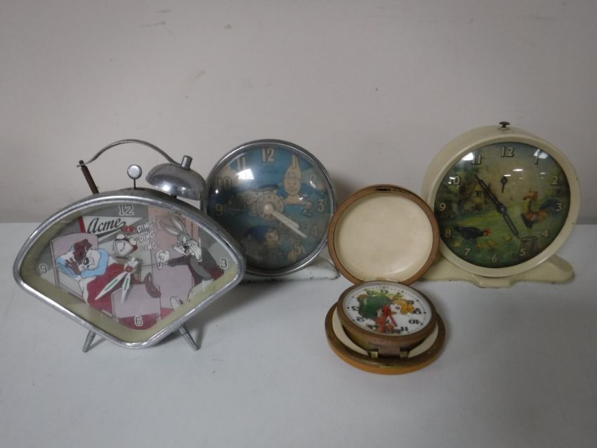 Three mid 20th century wind up alarm clock including a Noddy Smith's Timecal, Acme and one other together with a travel clock