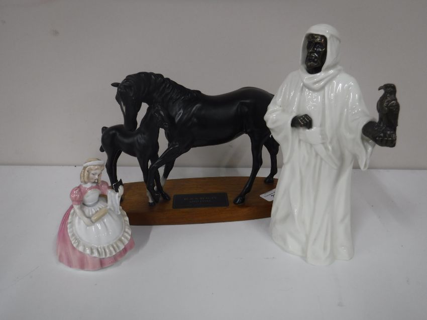 A Beswick Connoisseur model ' Black Beauty and Foal', together with a Royal Doulton figure 'cookie' and a Minton figure 'The Sheikh' (3 - a/f)