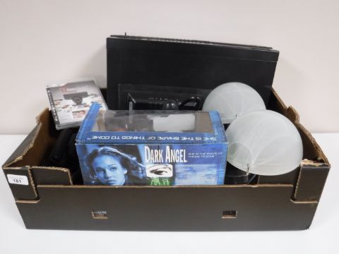 A box containing a Morantz compact disk player with remote, Playstation 3 controllers, digital camera etc