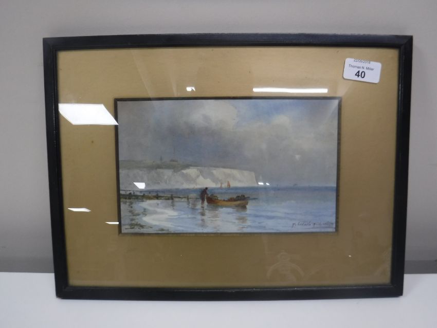 Twentieth Century School : A fishing boat and fisherman in calm waters with white cliffs beyond, watercolour, indistinctly signed and inscribed, 14 cm x 23 cm, framed.