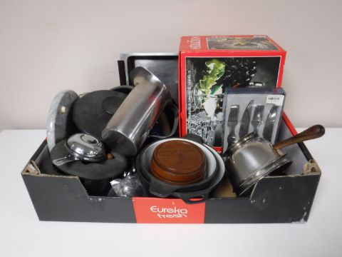 A box of wine glasses, cutlery, cast iron pans, stainless steel etc