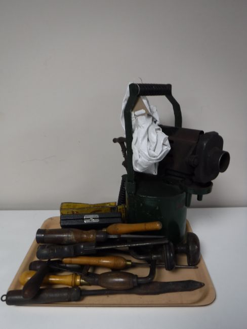 A tray containing vintage hand tools, cased precision gauge and a vintage paraffin burner