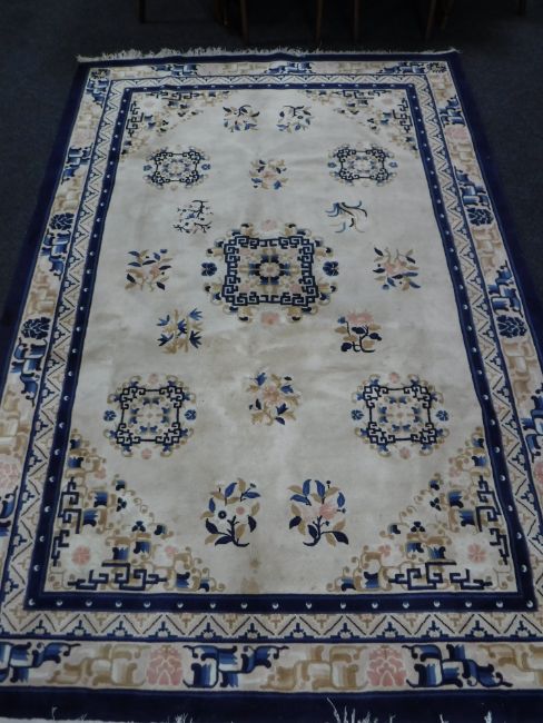 A fringed Chinese rug on cream ground, 275 cm x 184 cm.