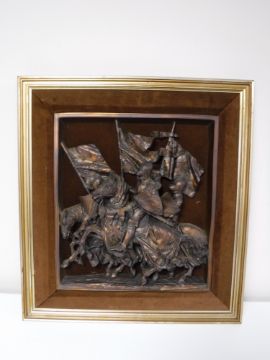 A set of folding stool steps, together with a framed relief panel; Knights on Horseback, and two framed mirrors