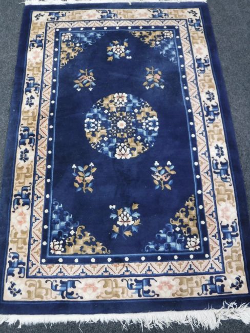 A fringed Chinese rug on blue ground, 182 cm x 122 cm.