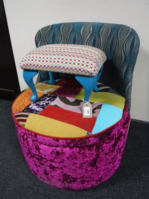 A bedroom chair upholstered in multi coloured fabric, together with a footstool