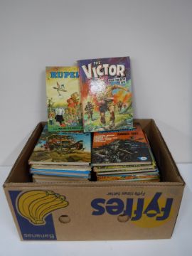 A box containing late twentieth century annuals, including Victor For Boys, Tom and Jerry, Oor Wullie etc
