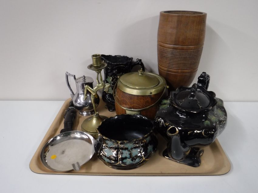 A three piece gilded Victorian tea service together with an oak brass lidded biscuit barrel, oak vase, plated ware etc