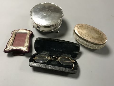 A silver dressing table casket, together with a silver dressing table pot, a small silver frame and antique spectacles.
