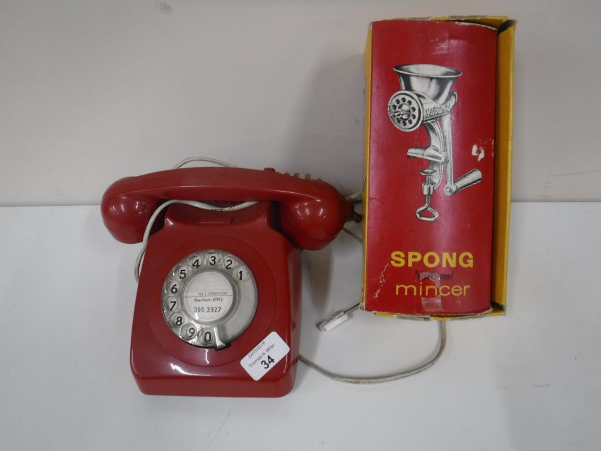 A vintage British Telecom red plastic telephone together with a boxed Spong mincer