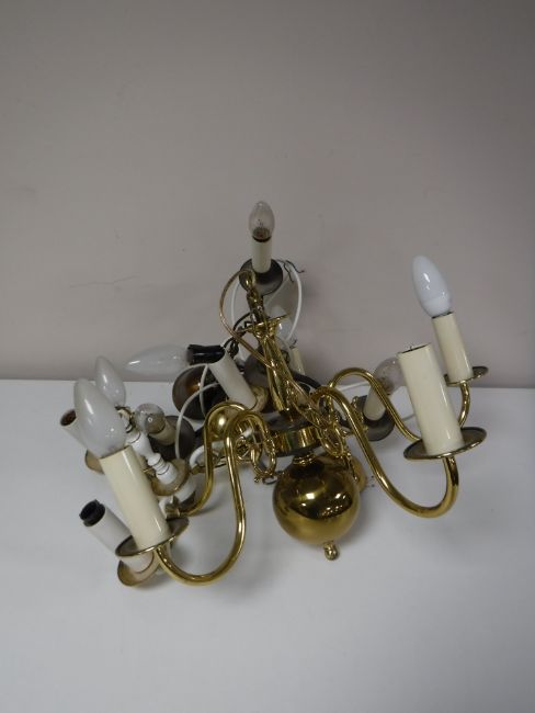 A continental brass five-way light fitting together with a copper three-way light fitting and a hanging light shade