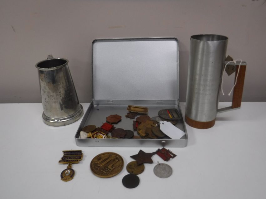 An interesting collection of thirty one badges and medals relating to athletics, swimming, sailing, foreign countries, etc., together with a pewter and a silver plated tankard both engraved with inscriptions relating to the R.A.F. (33)