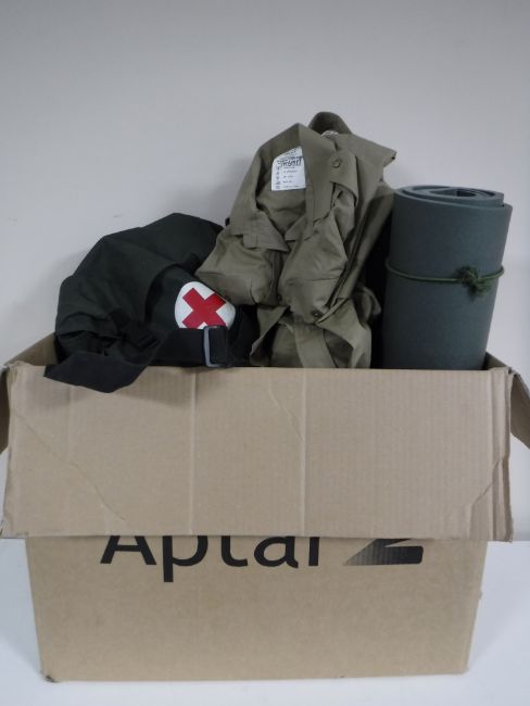 A box containing army surplus equipment, including British army and RAF shirts, rolled matt, two folding shovels and a first aid bag