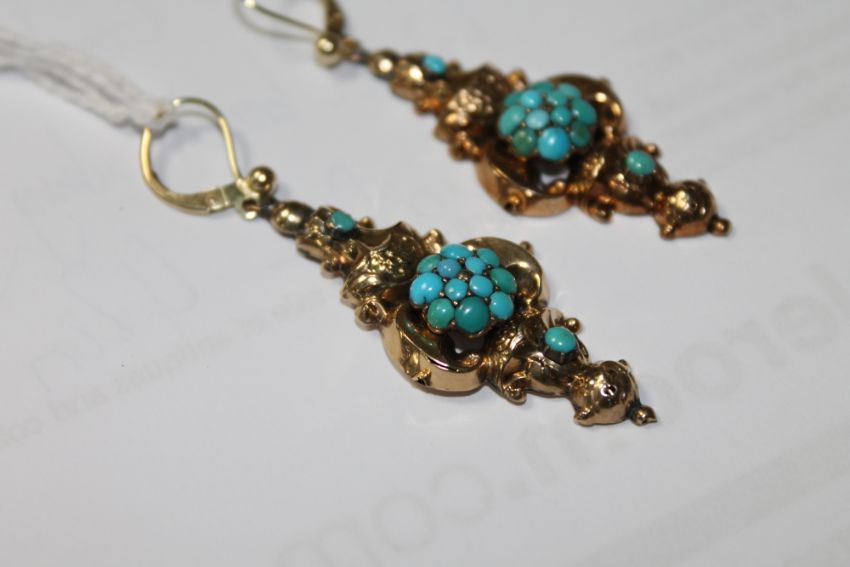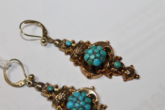 Slight aged discolouration to turquoise stones. Very minor splits forming in the gold mounts. Stamped 585. Earrings are 5.5cm long. Brooch measures 4cm by 3cm. Gross weight 9.2g.