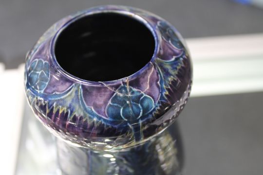 Morris ware vase 15cm high. Crazed throughout. Rim with restorations and several hairline cracks, see images.