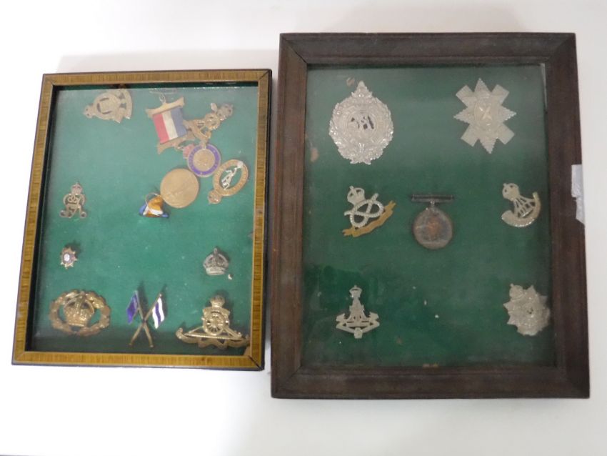 A collection of WWI medals, military cap badges, coronation medal, in two frames