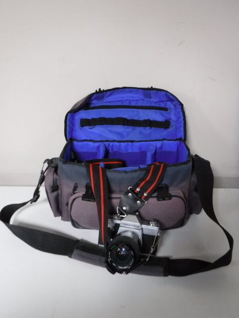 A camera bag containing a Praktica MTL3 camera with lens and accessories
