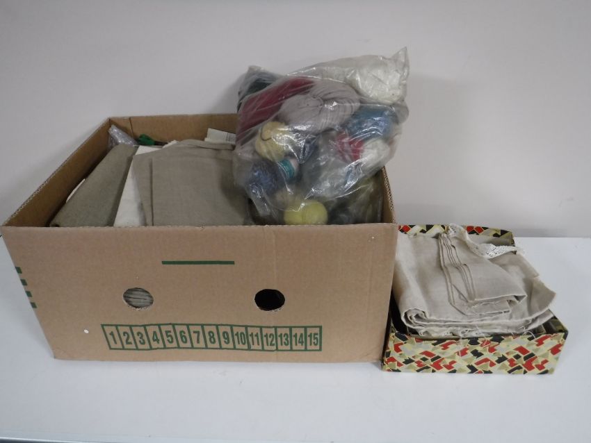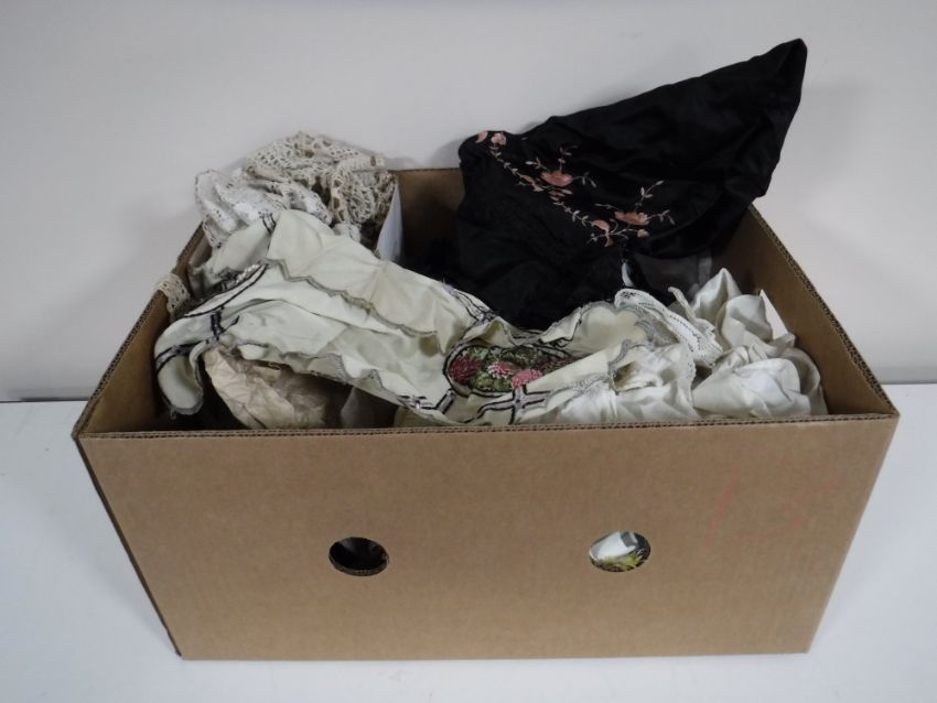 Two boxes containing vintage linen and clothing, cross stitch materials