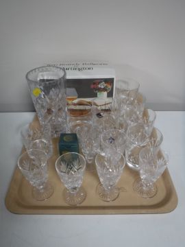 A tray containing assorted lead crystal glassware, including Edinburgh Crystal whiskey tumblers, Stuart Crystal liqueur glasses, etc