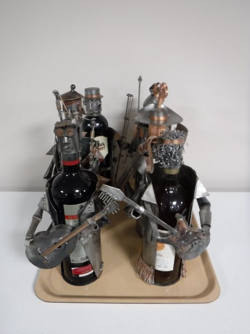 A tray containing six contemporary wine bottle holders, together with three bottles of red wine, together with a bottle of ginger beer