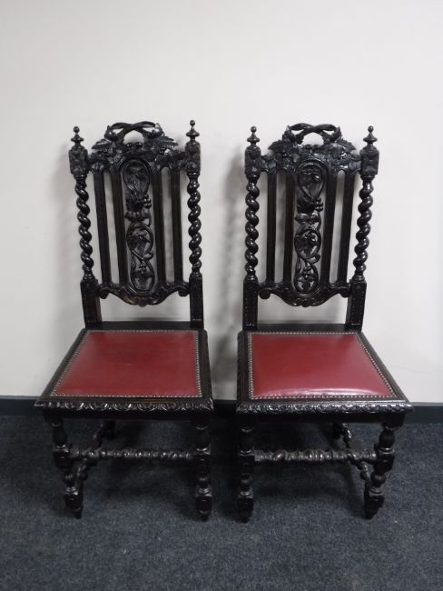 A pair of heavily carved oak barley twist chairs