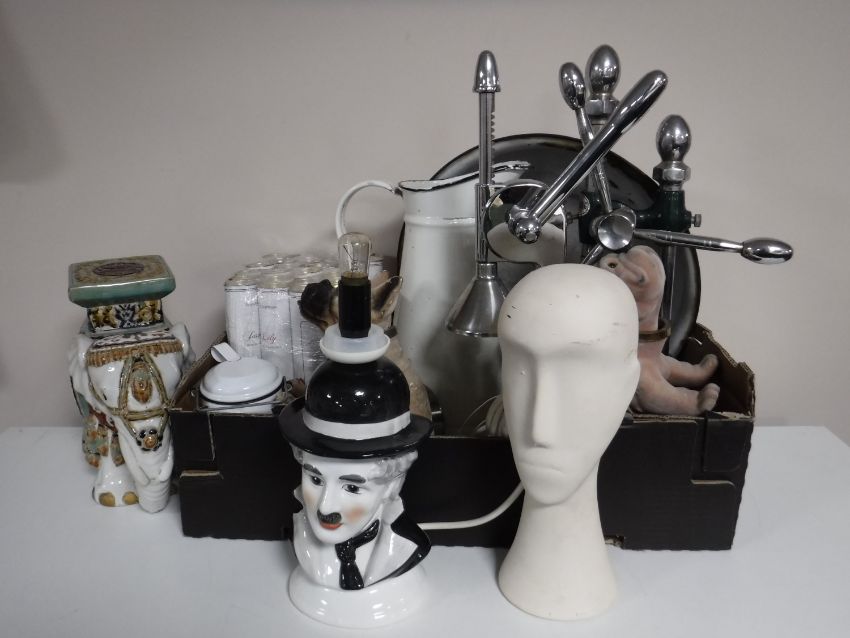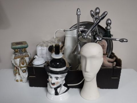 A box containing an enamelled jug and basin, juicers, nodding dog figure, together with two boxes of incense sticks, china elephant plant stand, etc