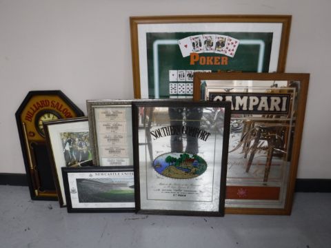 A framed wooden billiards sign, two picture mirrors, 'Southern Comfort' and 'Campari', two Newcastle United prints, a framed poker rules, together with a set of framed Binnion's casino vouchers