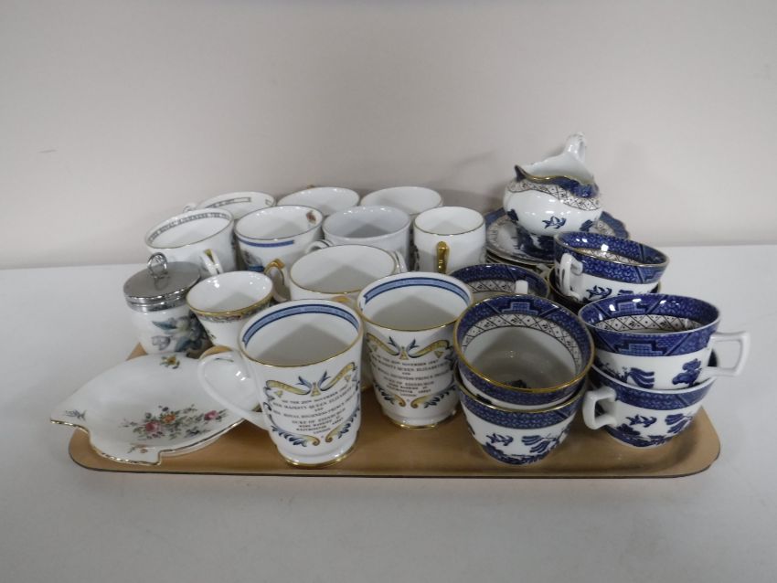 A tray of fifteen pieces of Booths Real Old Willow china, commemorative mugs, egg coddler, Minton dish etc