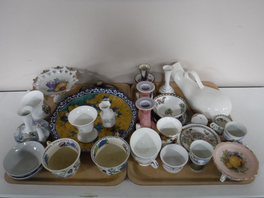 Two trays of Masons mugs, commemorative mugs, Royal Albert Old Country Roses vase, Indian Tree pattern china, wall plate etc