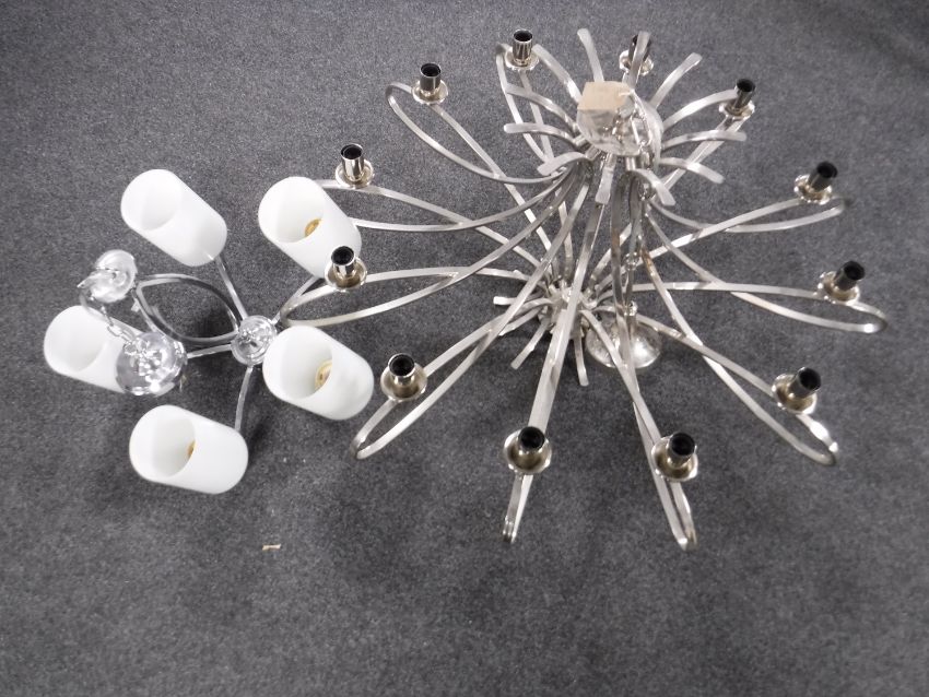 A chrome twelve branch chandelier and a five branch chandelier with glass shades