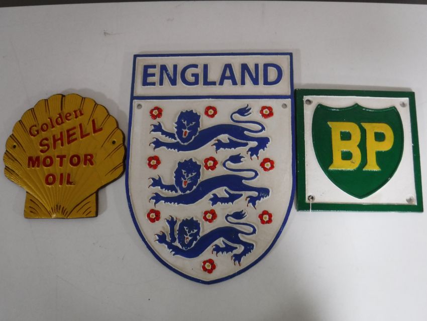 Three cast metal advertising signs, including an England crest, BP and Shell