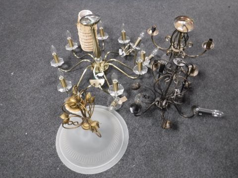 A contemporary brass eight-way light fitting together with a pair of matching wall lights and Three contemporary light fittings