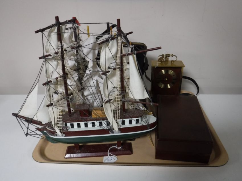 A tray of four wooden model ships on stands, cased binoculars, vintage Remington shaver and a carriage clock