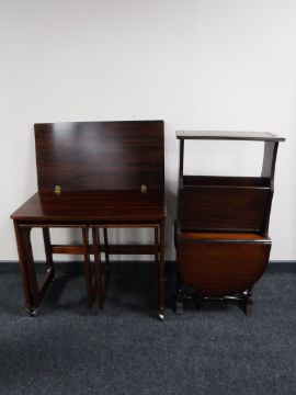 A mid twentieth century turnover top side table, fitted two beneath, together with an inlaid mahogany drop leaf coffee table and a mahogany leather topped magazine rack