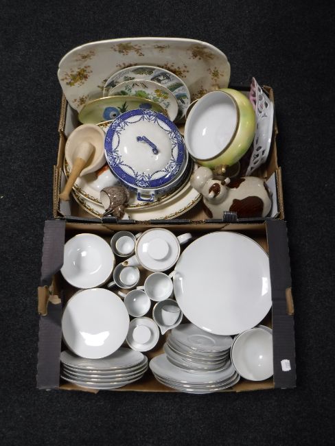 Two boxes containing a Thomas dinner service, meat plates, assorted china, together with a large pottery vase