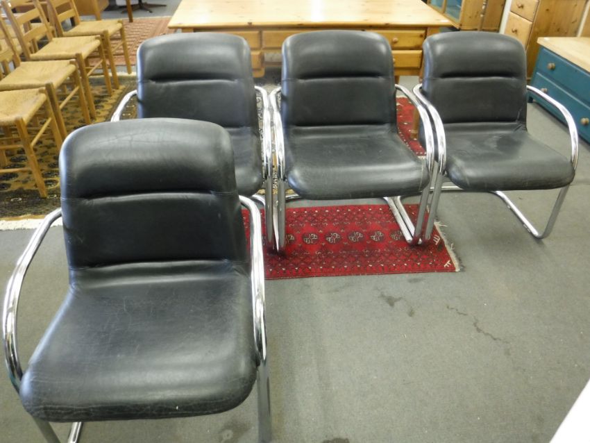 A set of four black leather armchairs with chrome tubular frames