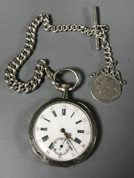 A silver pocket watch with silver Albert and medal.
