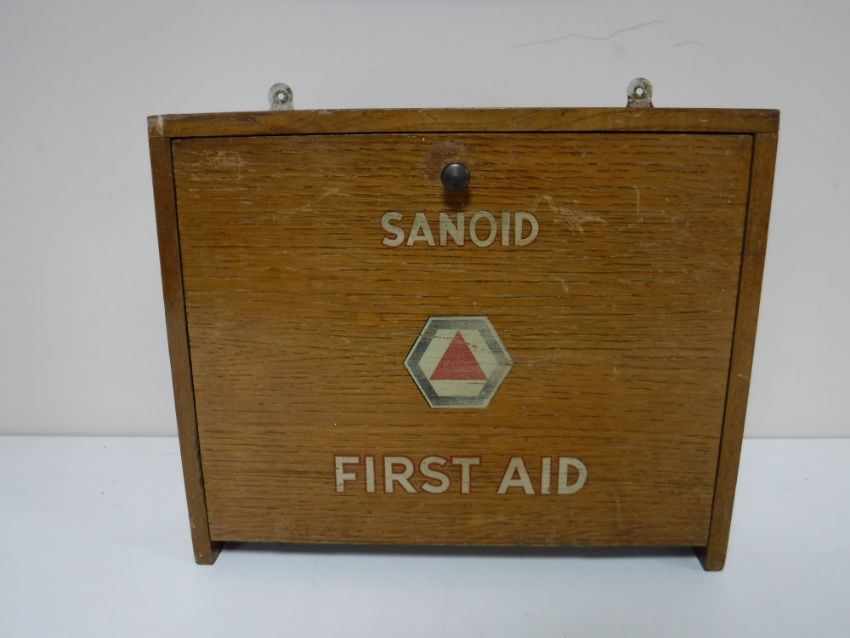 A mid 20th century oak Sanoid first aid box