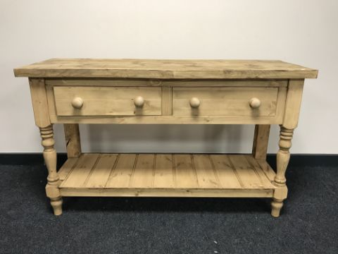 A reclaimed pine two drawer kitchen table with undershelf