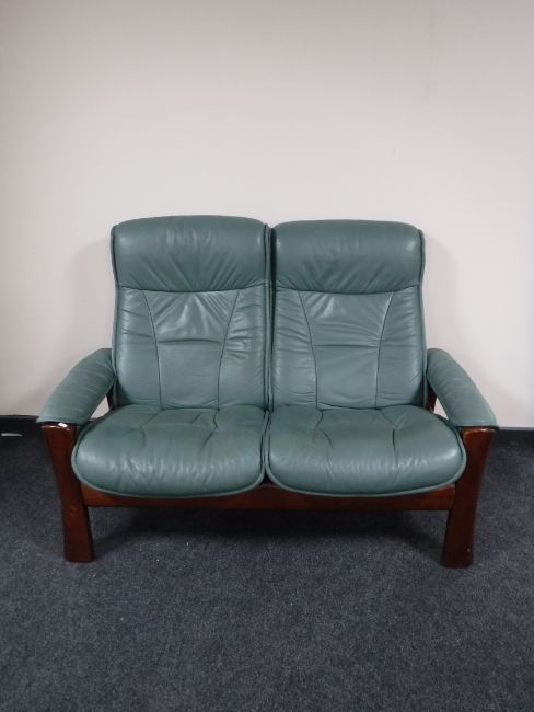 A five piece Ekornes green leather lounge suite, comprising of two seater settee, pair of reclining chairs with trays and matching footstools