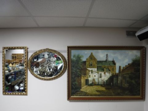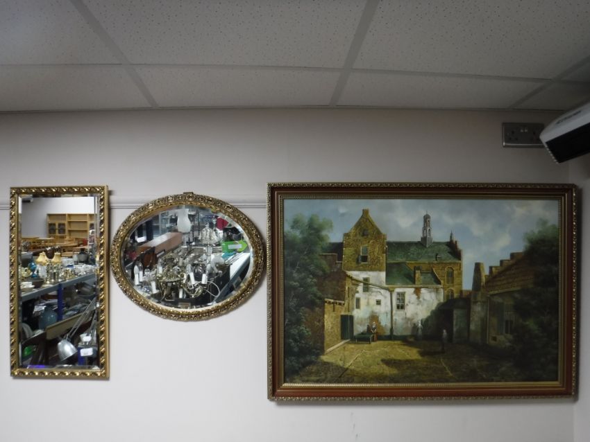 A gilt framed hall mirror, gilt oval mirror and a framed oil on canvas