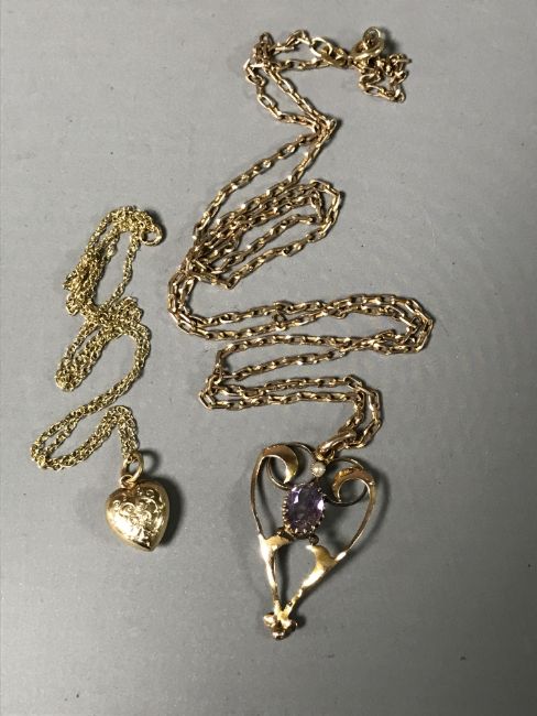 A 9ct gold Victorian pendant on chain together with a 9ct gold heart on chain. (2)